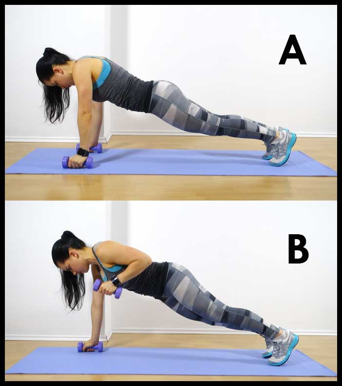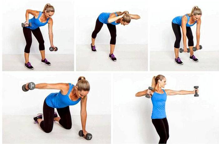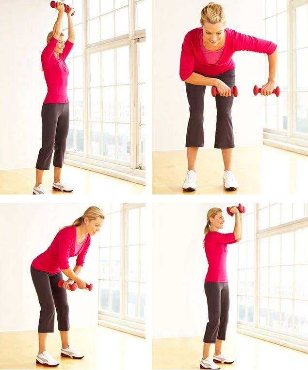 Станьте на коленки, одной рукой обопритесь о пол, а во вторую возьмите гантель. Поднимите гантель вверх под прямым углом. Затем опустите руку и сделайте такие же действия со второй рукой. Повторите по 10 раз для каждой руки.