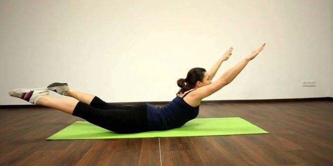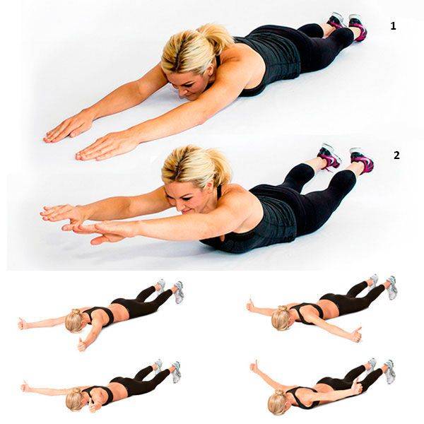 Лягте на живот. Приподнимите вытянутые руки и ноги как можно выше. Потянитесь, задержитесь на полминуты и вернитесь в исходное положение. Повторите 10 раз. Такое упражнение укрепит спину, улучшит осанку и поможет быстрее убрать жировые бока с поясницы.