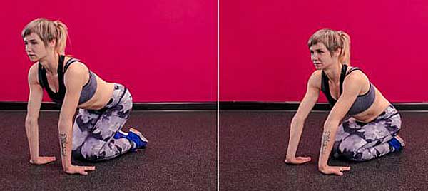 Требуется сесть на пол. Обязательно на ноги. Руки расположены перед собой тыловой частью на поверхность пола. Пальцы находятся друг к другу. Локти – прямые. Часть массы переходит на руки. Так лучше растягиваются мышцы. Пальцы тянутся к центру ладони. Пытайтесь сжимать кулаки. Число повторов – 8. Подходов – 4.