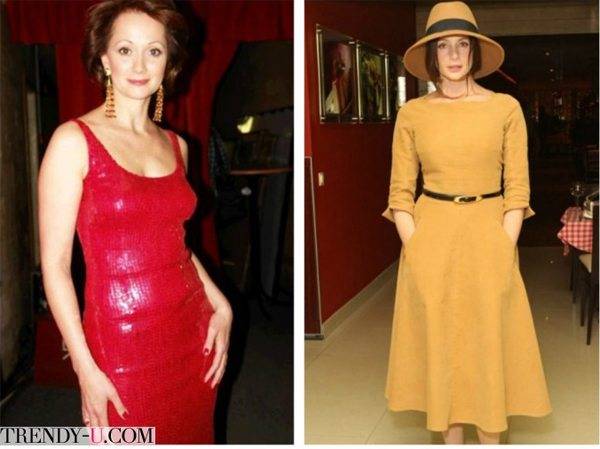 У Оксаны небрежно собранные волосы и модное, простое и лаконичное платье с расклешенной юбкой изысканного горчичного цвета. Стильный штрих — шляпа в тон платью актуального фасона. У Оксаны прекрасный вкус, в простоте и скромности ее наряда есть глубина и ощущение момента. Она одета современно и потому выглядит моложе!