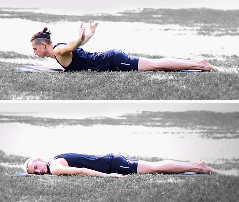 - Ложимся на живот. Руки отводим в стороны. Плечи разворачиваем наружу таким образом, чтобы ладони были направлены вперед, а большие пальцы вверх.