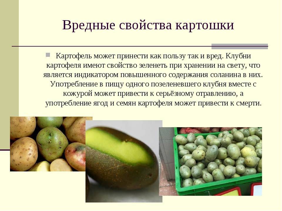 Обычно это происходит при неправильном хранении урожая. На свету клубни выделяют хлорофилл, из-за чего плоды зеленеют. Именно в таких овощах накапливается больше всего соланина. Биологи считают, что таким образом картошка защищается от микробов, заболеваний, вредителей. Самая большая концентрация вещества — в кожуре. Желательно совсем не употреблять такие клубни в пищу, вред картофеля в таком виде очевиден, в большом количестве опасно для здоровья.