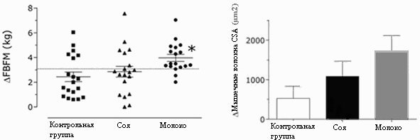 В этом исследовании 56 здоровых нетренированных парней были включены в строгую, высокоинтенсивную тренировочную программу упражнений на сопротивление 5 дней в неделю, на 12 недель, и получали одну из 2 чашек обезжиренного молока, соевого молока или углеводов непосредственно сразу после тренировки, и опять через час. В течение 12 недель программы полная диета была достаточно простая во всех группах, за исключением углеводной группы, которая под конец стала получать немного больше углеводов.