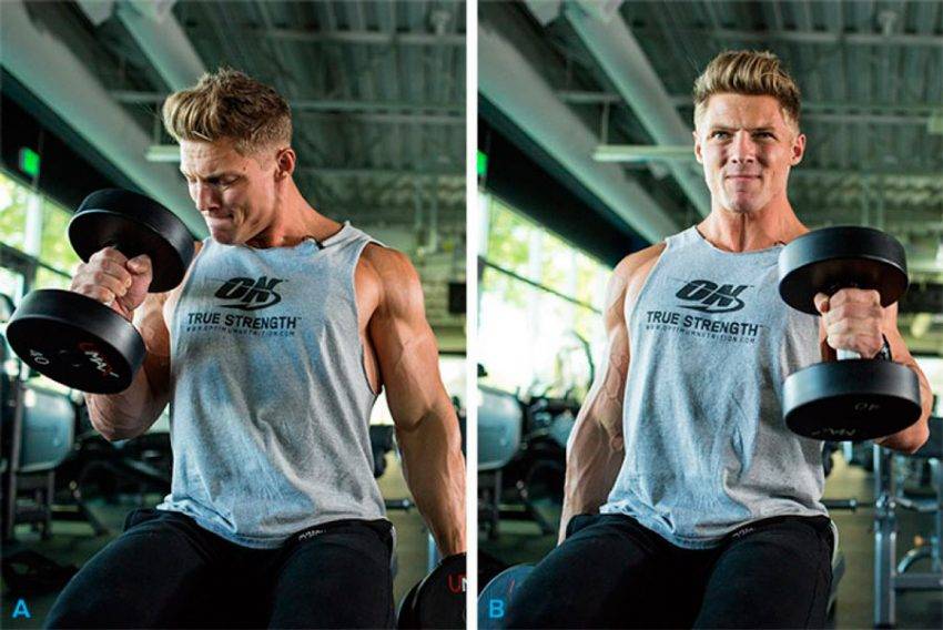 - Подъем с супинацией. Так называют классический подъем гантелей на бицепс в концентрированном стиле сидя, но когда атлет разворачивает руку ладонью вверх;