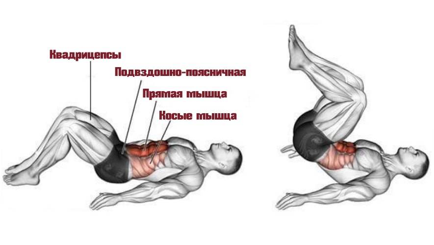 - Подвздошно-поясничная мышца. Она отвечает за сгибание ног в тазобедренном суставе. В данных скручиваниях работает в статике, удерживая ноги в согнутом положении.