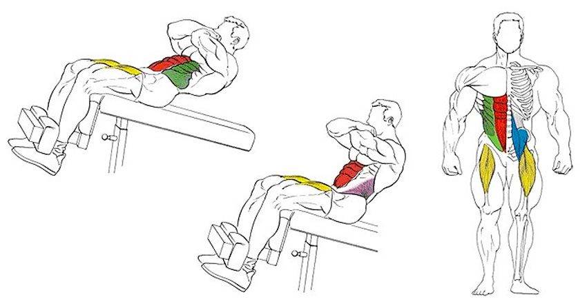 Самая популярная ошибка, десятилетиями насаждалась в спортивных кружках, на физкультуре, и даже в современных тренажерных залах. Это амплитуда движения! Техника скручиваний на наклонной скамье не подразумевает полного подъема корпуса! Не нужно держать спину ровной! Как следует из названия упражнения – это скручивания, а не подъем корпуса. Амплитуда, должна быть очень небольшой! Но почему? Ведь десятилетиями пресс качали намного сложнее, с полным подъемом корпуса, что казалось намного тяжелее. Все очень просто, если держать спину ровной, большую часть нагрузки съедает не мышцы пресса. В большинстве случаев они вообще отключаются. Вместо этого нагрузка ложится на: