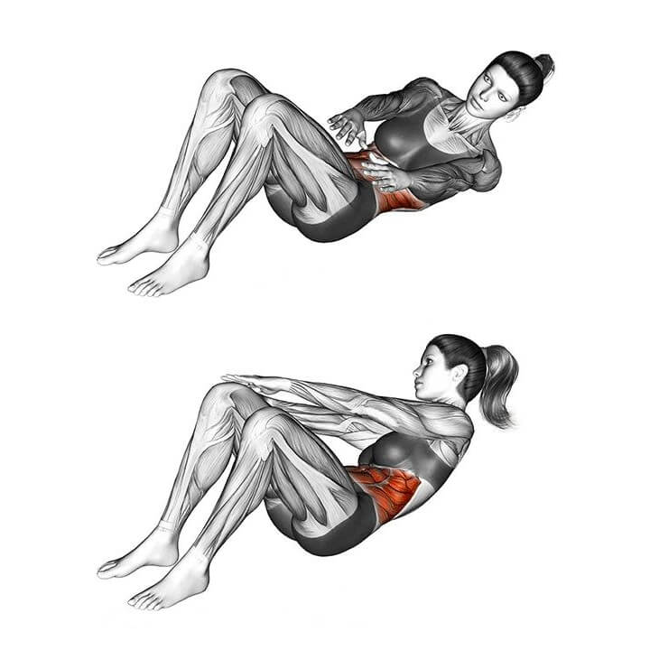 От пола (либо от скамьи) сначала отрывается голова, шея и далее позвоночник. Позвонок за позвонком, очень плавно, скручивайте тело. Не садитесь и ложитесь! Вы должны именно скручивать корпус. Для лучшего понимания техники выполнения движения, представьте, что на животе у вас лежит мяч и вы должны его обхватить животом.