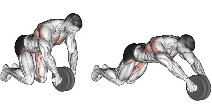 - Разгибание из положения стоя на коленях. Встаем на коленки, ролик находится на полу. Постепенно откатывать колесо вперед. Корпус вытягивается, не касаясь пола. Очень медленно вернуться в начальное положение.
