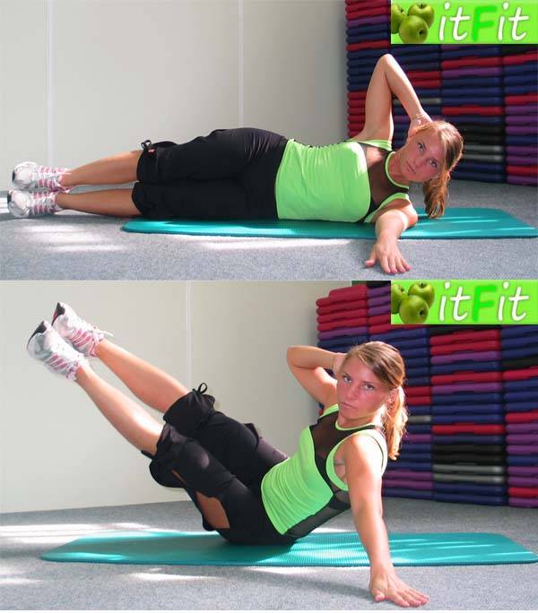 | 3. Боковые скручивания на боку | Динамическое + статическое // Косые мышцы пресса | 5-7 повторов на каждую сторону тела с задержкой на 5-10 секунд в верхней точке. Суммарно 2-3 подхода на каждую сторону. |