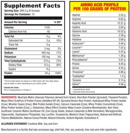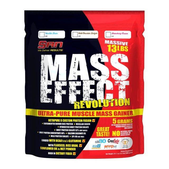– действие правила 80% протеина и 20 % комплекса углеводов из клетчатки:Пока атлеты бредят о преимуществах бурого риса для человеческого организма, разработчики SAN раскрыли секрет специального состава концентрата протеина (SILK-80 Brand), входящего в Mass Effect, который заключается в содержании 80% протеина и 20% углеводов. Это сочетание идеально для атлетов в любом виде спорта.