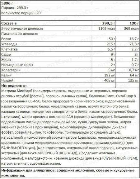 Порция гейнера содержит основные ингредиенты: