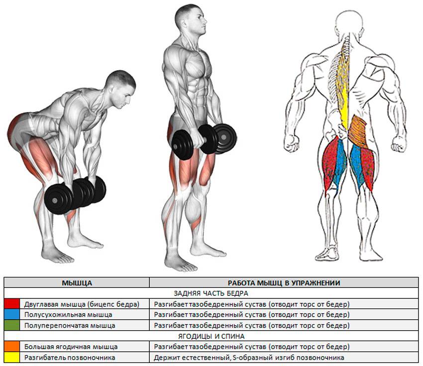 Она направлена на проработку задней поверхности бедра, а нагрузка на длинные мышцы спины значительно снижается. В фитнесе и бодибилдинге «мертвую» становую тягу включают в тренинг проработки бицепса бедра.