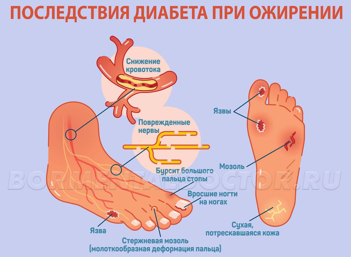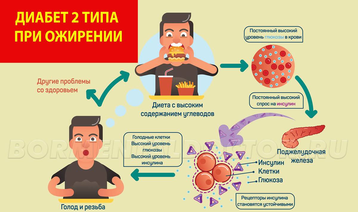 Диабет — постоянный спутник ожирения, поскольку инсулин стимулирует накопление жира. По данным Американской диабетической ассоциации ожирением страдают 80% диабетиков. Верен и обратный процесс: ожирение провоцирует развитие диабета II типа, когда организм перестаёт реагировать на выработку инсулина. Уровень сахара в крови при этом растёт, вызывая мучительные состояния: постоянную жажду и голод, тревожность, головокружение, диурез, кожный зуд и т. д. Среди грозных последствий болезни — диабетическая кома, слепота, трофические язвы. О связи диабета II типа и избыточного веса красноречиво свидетельствуют приведённые ниже цифры.