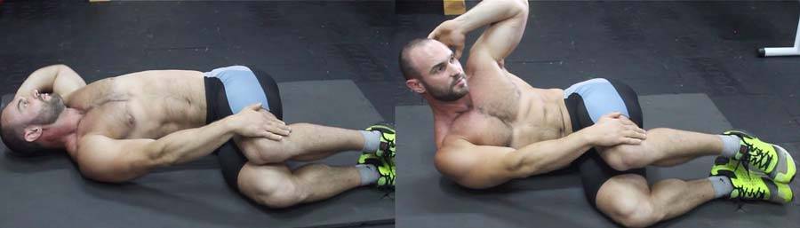 Боковые скручивания на полу. Это упражнение для косых мышц пресса. Ложитесь спиной на пол, а ноги, согнутые в коленях, положите на бок. Бедро находится под прямым углом с корпусом. Рука, что ближе к полу, фиксирует ноги. Другую – держите за головой. Делайте скручивания косых мышц пресса сначала с одной стороны, а затем с другой.