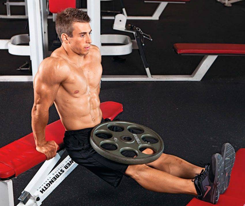 Ну и конечно же самый сложный вариант. Чтобы его выполнить, понадобиться две скамьи для жима лежа. Установите их параллельно друг другу. Расстояние подбирается индивидуально под ваш рост. Главное, чтобы ноги лежали на краю скамьи и были полностью прямыми. Исходная позиция идентична предыдущей. Упираемся руками в край одной скамьи, а ноги кладем пятками на другую. Лопатки сведены, спина прямая, взгляд направлен вперед. Мышцы пресса напряжены. Также мы можем усложнить упражнение, положив себе на ноги отягощение. В основном используют диск от штанги («Блин» в простонародье). Его просто кладут себе на ноги ближе к тазу. И выполняют обратные отжимания. По началу будет не совсем удобно это делать. Но немного потренировавшись вы приловчитесь. Также проблему, с тем чтобы положить и убрать блин, можно решить с помощью партнера по тренировкам. Ну или тренера если вы пользуетесь данной услугой.