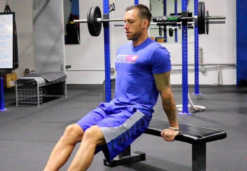 Это уже более сложная вариация обратных отжиманий. За счет того, что мы руками будем упираться не в пол, а в скамью. Ну или любую другую возвышенность: скамью, стул, диван или невысокий турник. У нас увеличится амплитуда движения. И мы сможем задействовать весь потенциал нашего трицепса. Но не забывайте про риск травмировать дельту! Поэтому опускаться вниз следует до того момента, пока вы не начнете испытывать болевые ощущения в плечах. Если почувствовали, значит это ваша максимальная глубина движения. Для того, чтобы выполнить данный вариант, нам понадобиться скамья для жима лежа. Иногда используют степ платформу, но на мой взгляд у нее очень маленькая высота. И поэтому упражнение сильно отличаться от отжиманий от пола не будет. Установите скамью. Сядьте на нее и упритесь ладонями в ближний к вам край. Пальцы развернуты в направлении пяток. Выпрямите полностью руки, а тело подайте немного вперед, чтобы при сгибании рук, вы могли опуститься вниз. Что касается положения ног, тут действует такой же принцип. Вы можете их согнуть в коленном суставе и упирается ступнями в пол. Данная постановка ног, обеспечит более легкое выполнение упражнения, за счет того, что они будут забирать часть веса вашего тела на себя. Если же хотите усложнить упражнение, тогда выпрямите ноги и пятками упретесь в пол. Вы сразу же заметите разницу.