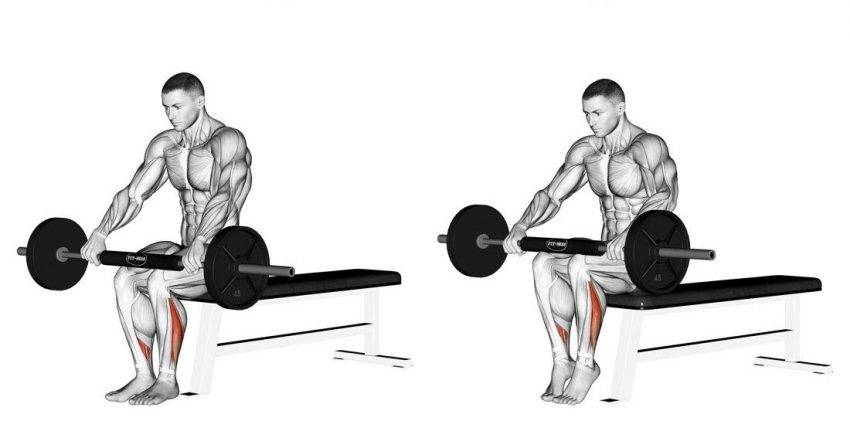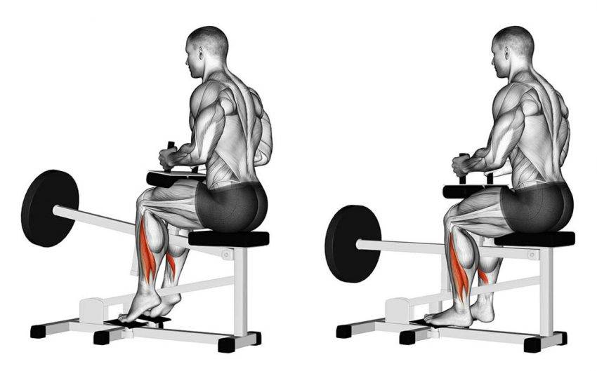 Упражнение сидя больше прорабатывает среднюю часть голени, и задействует камбаловидную мышцу. Вариантов его выполнения может быть два – в тренажере, либо со свободными весами