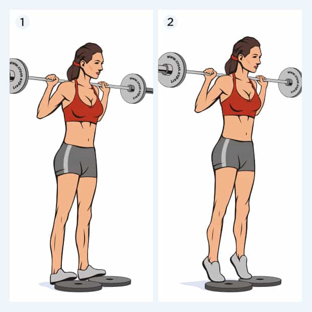3. Отталкивайтесь ногой от блинов и поднимайтесь на носок как можно выше.
