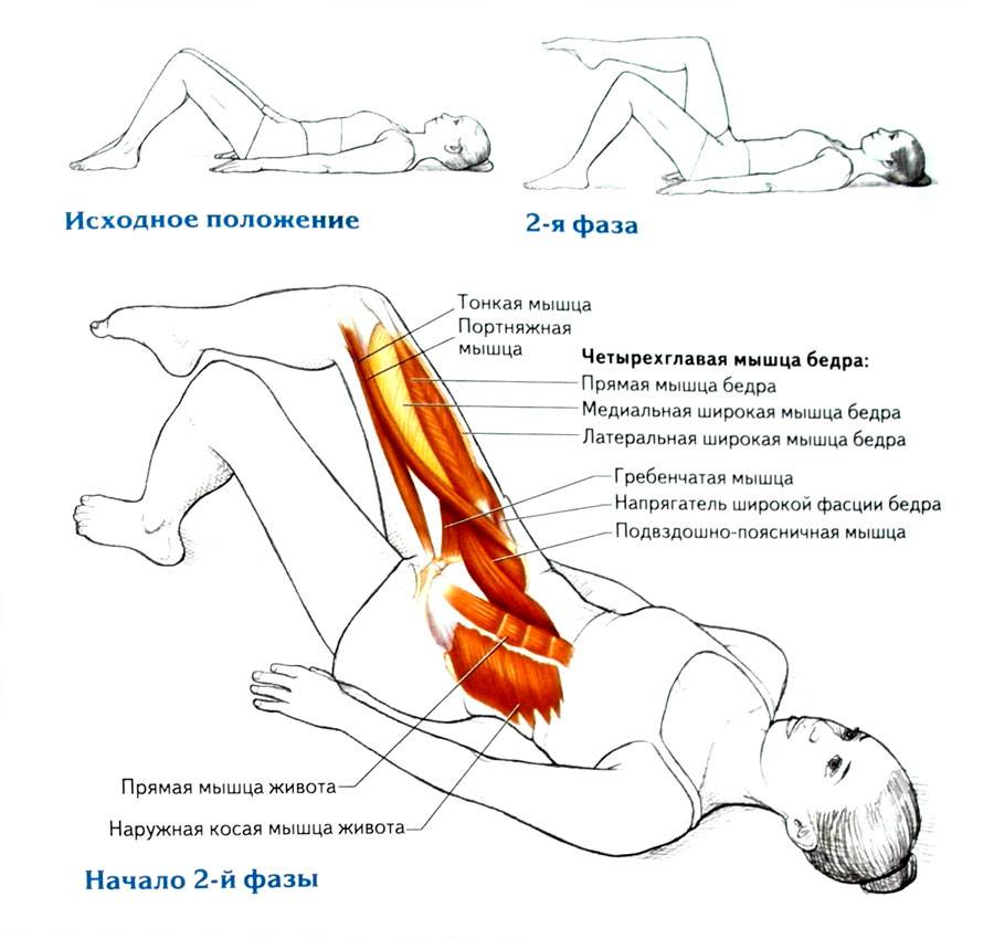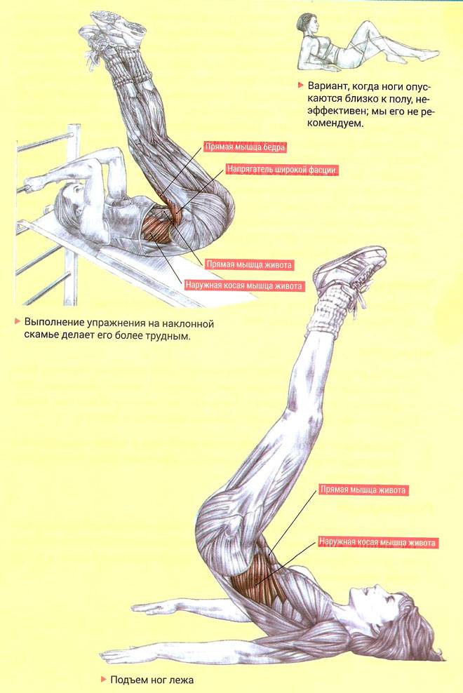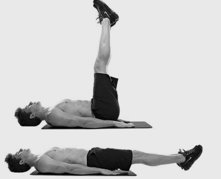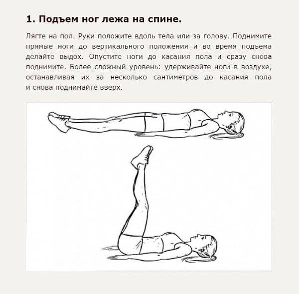 Людям нетренированным надо начать с поочерёдного подъёма ног лёжа. При этом руки должны быть вытянуты вдоль тела, а поясница плотно прижата к полу. Ноги поднимаются попеременно до 45 градусов