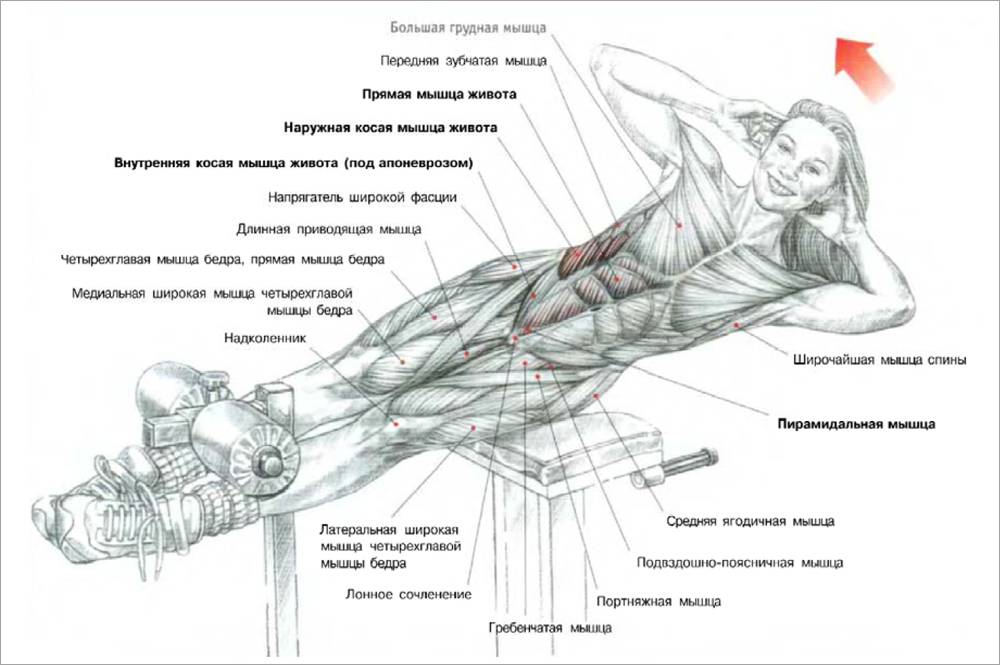 Самая популярная ошибка, десятилетиями насаждалась в спортивных кружках, на физкультуре, и даже в современных тренажерных залах. Это амплитуда движения! Техника скручиваний на наклонной скамье не подразумевает полного подъема корпуса! Не нужно держать спину ровной! Как следует из названия упражнения – это скручивания, а не подъем корпуса. Амплитуда, должна быть очень небольшой! Но почему? Ведь десятилетиями пресс качали намного сложнее, с полным подъемом корпуса, что казалось намного тяжелее. Все очень просто, если держать спину ровной, большую часть нагрузки съедает не мышцы пресса. В большинстве случаев они вообще отключаются. Вместо этого нагрузка ложится на: