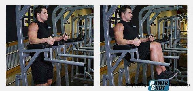 При выполнении подъема ног в тренажере, когда вы опираетесь согнутыми в локтях руками, и поднимаете ноги (чаще всего в этом тренажере выполняются и отжимания на брусьях) в работу включаются по большей части передние мышцы бедер.