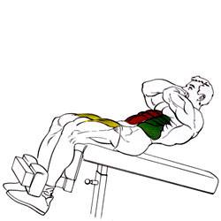 При произведении скручиваний на наклонной гимнастической скамье работают в основном прямые и косые мышцы живота. Но мы упоминали уже, что при прямой спине будет сильно напрягаться поясничный ее отдел.