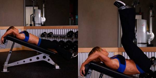 - Двойные скручивания. После принятия первоначального положения тела, нужно обхватить скамью по бокам руками, после чего – подтянуть колени к грудной клетке. Следующим шагом является выпрямление ног без прикосновений к полу. Упражнение рекомендуется выполнять не менее 20 раз, для достижения желаемого результата.