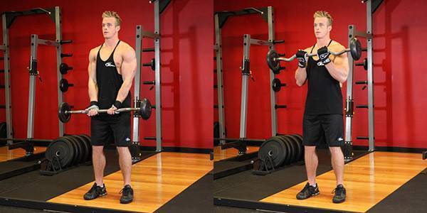 Этот вариант предусматривает использование штанги с прямым грифом – «олимпийской». Тут также присутствует некоторое разнообразие: хват осуществляется ладонями вверх на уровне ширины плеч или используется прямой хват штанги – ладонями вниз. Вариативные подходы позволяют прорабатывать пучки бицепса – внутренний и внешний.