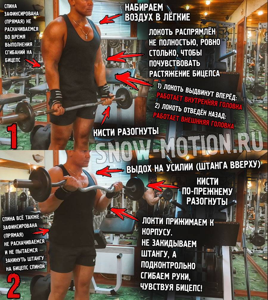Как видите, на картинке выше я выполняю подъём штанги на бицепс в его классической форме (когда локти чуть выдвинуты вперёд) и поднимаю штангу по большой дуге, а не в сокращённом варианте.