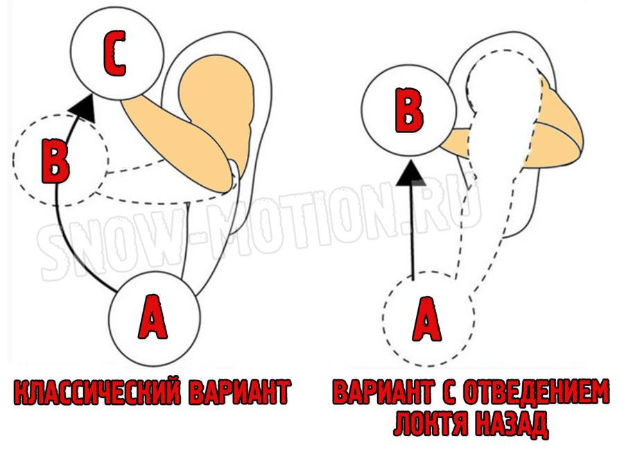 1. Первый (классический вариант): сложнее с точки зрения подъёма, т.к. большая нагрузка создаётся дополнительно в точке «В». Такой вариант позволит взять меньший вес, но время нахождения мышцы под нагрузкой больше при прочих равных.