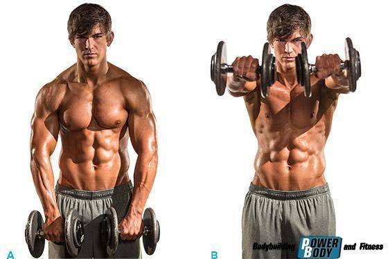 - Это упражнение также может быть выполнено путем поочередных подъемов гантелей, это означает сначала сделать одно повторение правой рукой, а затем одно левой, снова правой и т.д.