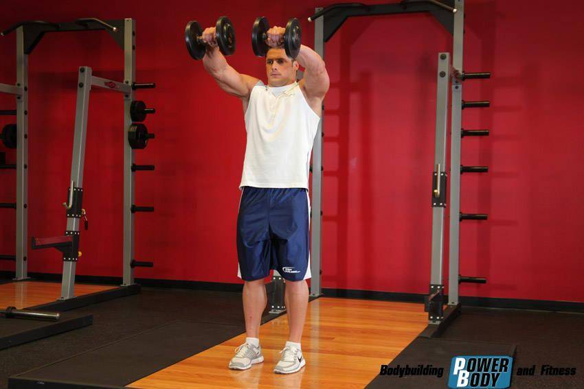 Поднимите гантели до уровня плеч, разверните грудь, сведите лопатки. Теперь опустите плечи. Выжмите гантели вверх и чуть уведите за голову. Опустите их в исходное положение и повторите.