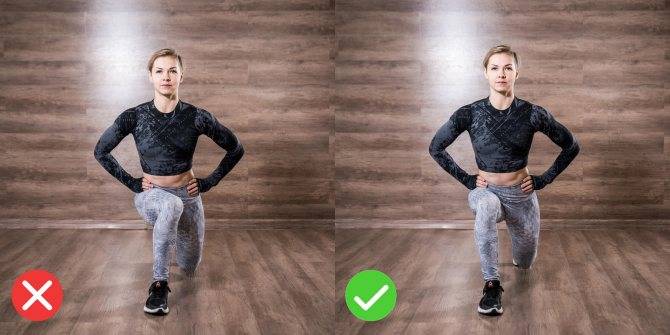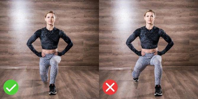 Если делаете выпады вперёд, назад или накрест — пока между полом и коленом сзади стоящей ноги не останется около 5–10 см.