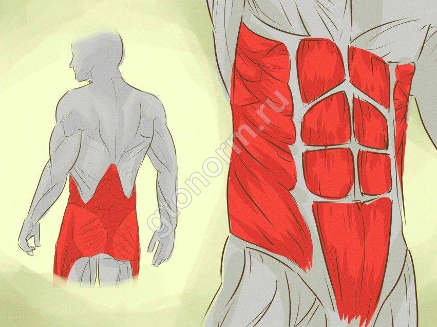 Разгибатели — это два толстых лоскута, которые располагаются по обе стороны от позвоночника от шеи до самого таза. Именно благодаря им человек может наклоняться, выполнять вращение туловищем и т.д. Прямая и косая живота находятся в брюшной области. Эти места качают и тренируют для того, чтобы добиться красивых кубиков пресса.