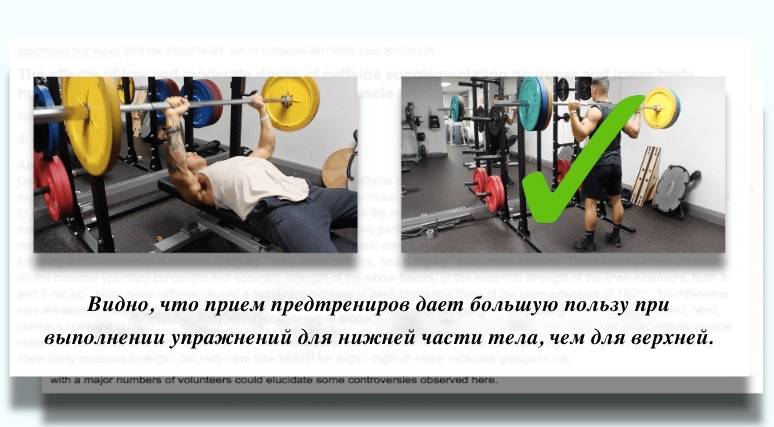 Скорее всего это потому, что мы всегда воспринимаем упражнения для ног как более сложные и изматывающие, чем упражнения для рук. И так как предтреники снижают общую усталость и создают впечатление большей физической силы, мы лучше замечаем их эффект, когда выполняем упражнения для ног и бедер.