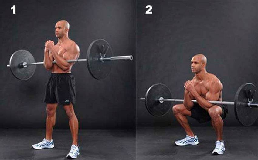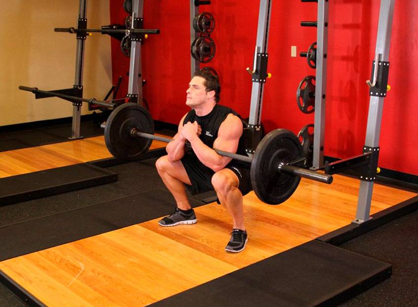 4. Удерживая штангу на руках, следует садиться чуть пониже обычной точки до параллели, так чтобы грифом дотронуться до колен.