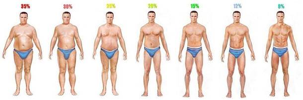 Содержание жира в организме 6—7%Содержание жира 10—12%Содержание жира в организме 15% Содержание жира в организме 20%Содержание жира в организме 25%Содержание жира в организме 30%Содержание жира в организме 35%Содержание жира в организме 40%