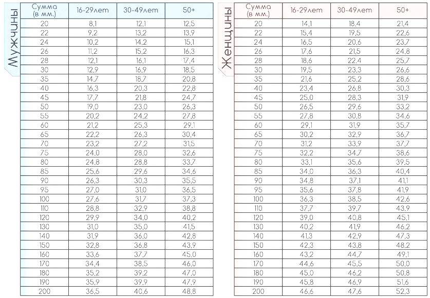 Складываем полученные цифры в мм и узнаём процент подкожного жира, пользуясь таблицей: