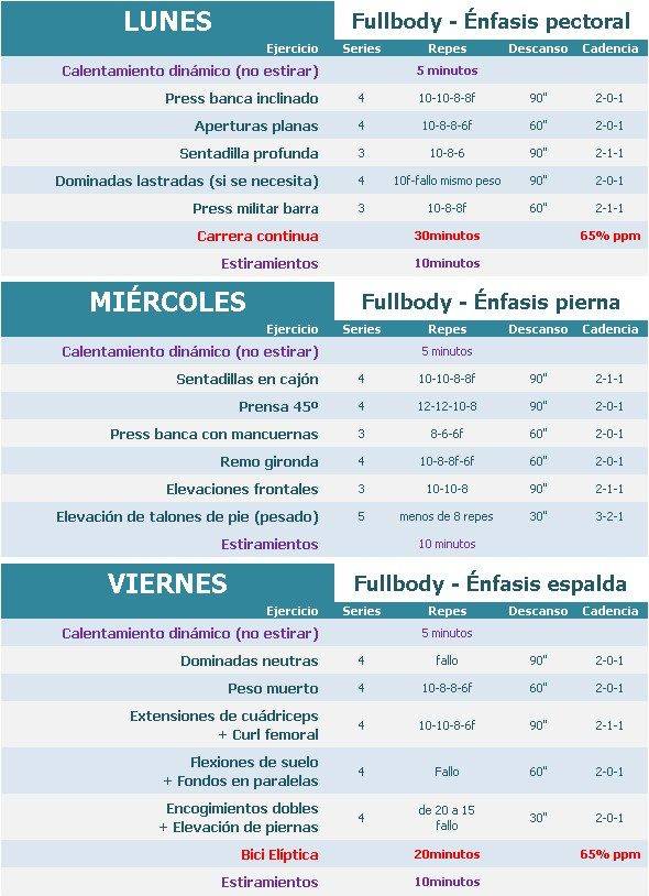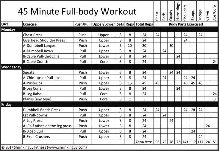 Как видно из названия, это фулбади тренировки. То есть на каждой тренировке вы будете нагружать всё тело. Будет по 6 упражнений. И в конце каждой тренировки – кардиотренажёр от 10 до 20 минут. Я советую использовать беговую дорожку или эллипс. Ну а вообще – что будет свободно.