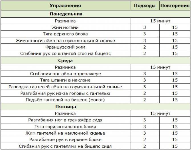 План я сделал несложным. И он вполне подойдёт для новичков, и для женщин, которые возвращаются к тренировкам после перерыва. Но если это ваши первые тренировки, то первую неделю сделайте все упражнения только по 2 рабочих подхода. Кстати, новичкам я всегда рекомендую начинать с планов, где не более 4-х тренировок в неделю. Поэтому, если 5 тренировок в неделю будет для вас слишком сложно, то вы можете один цикл делать не 7, а 9 – 10 дней. Так тоже можно. Например: ПН, СР, ПТ, ВС, ВТ.