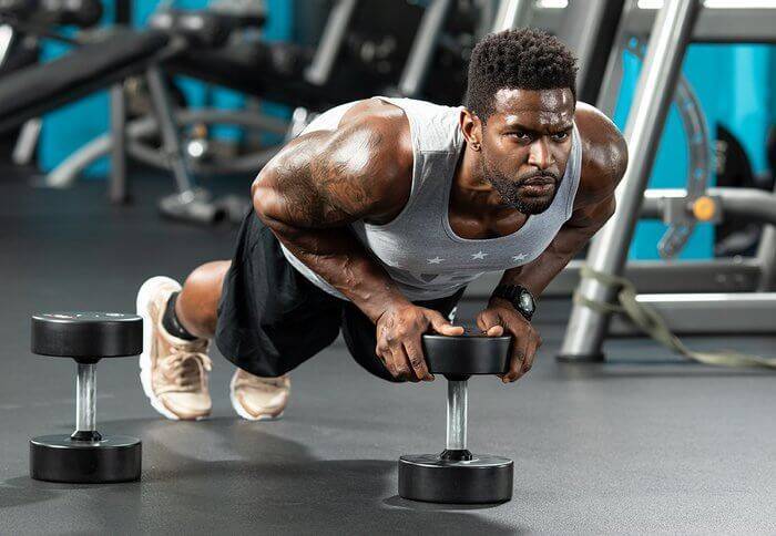- Удерживая локти вплотную к туловищу, медленно опуститесь вниз и вернитесь в исходное положение. Модифицируйте упражнение, сгибая колени, чтобы упростить задачу, или положите на них блин, чтобы увеличить нагрузку.
