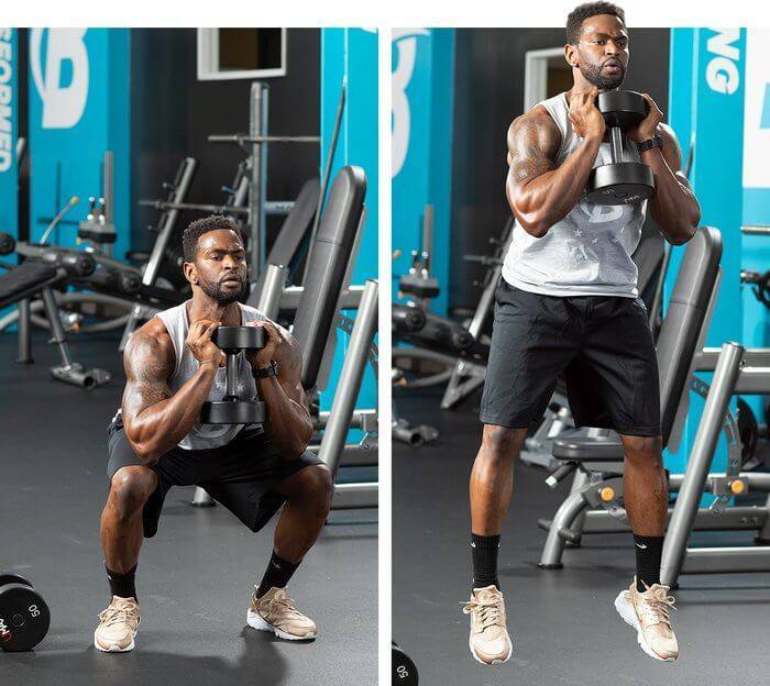 Держите одну гантель обеими руками ближе к груди под подбородком (кубком). Согните колени, по крайней мере, до тех пор, пока ваши бедра не будут параллельны полу или чуть ниже.