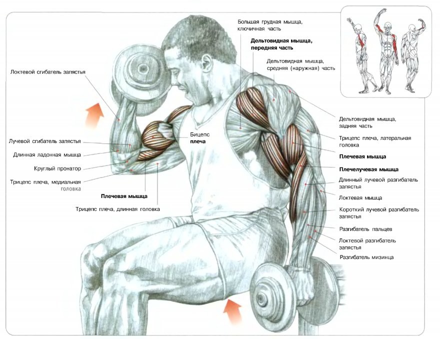 Это еще одно упражнение с гантелями для развития плеч. Как правило, включается во все программы для набора массы.