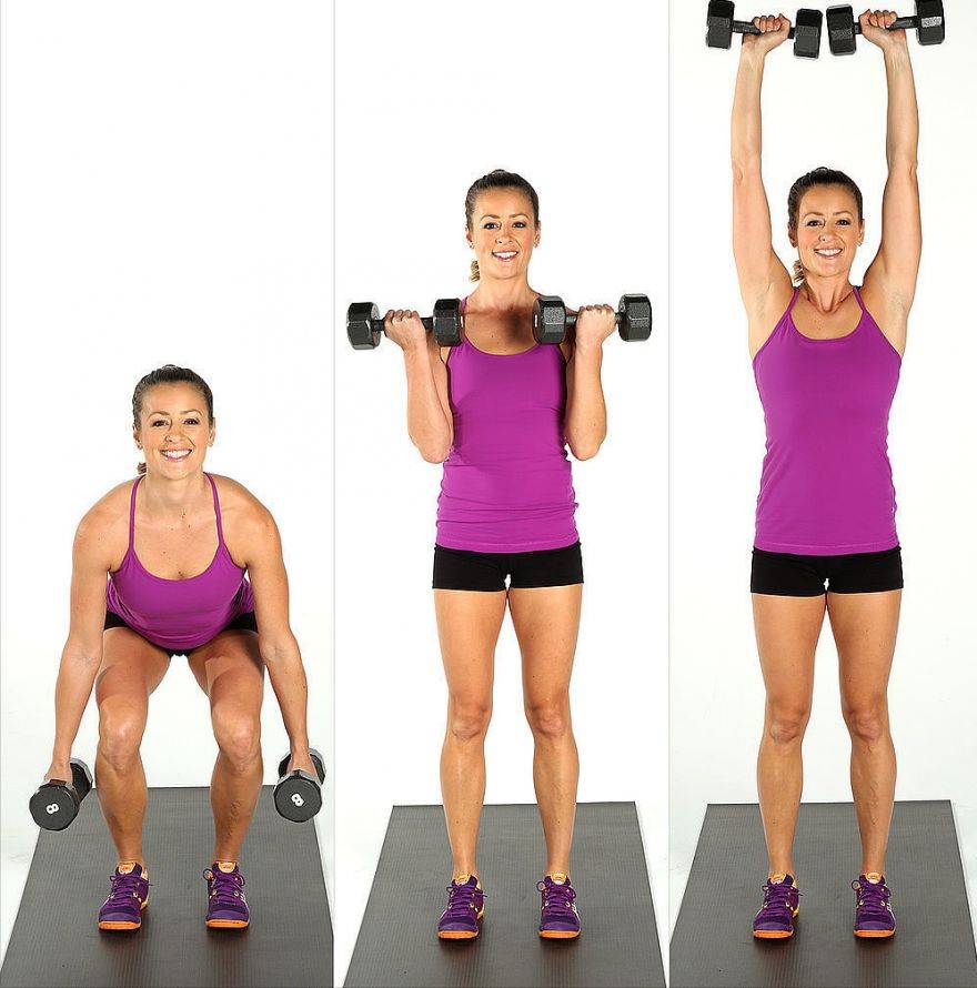В чем польза: Комбинированное многосуставное упражнение поможет вам укрепить трапеции и дельты, одновременно прорабатывая бедра и ягодицы.