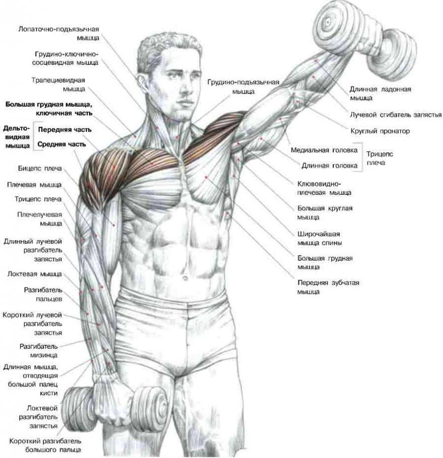 Одно из лучших упражнений на плечи. Именно это движение считается главным и базовым для средней плечевой дельты, отвечающей за «ширину».