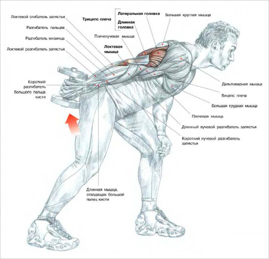 Старайтесь держать в локтях небольшой изгиб, во время всего движения. Это упражнение отлично подходит как для набора массы мужчинам, так и для корректировки фигуры женщинам. Минус только один: его достаточно проблематично выполнять в домашних условиях, так как нужна скамья или что-то подобное (подходящий стул, и т.д.).