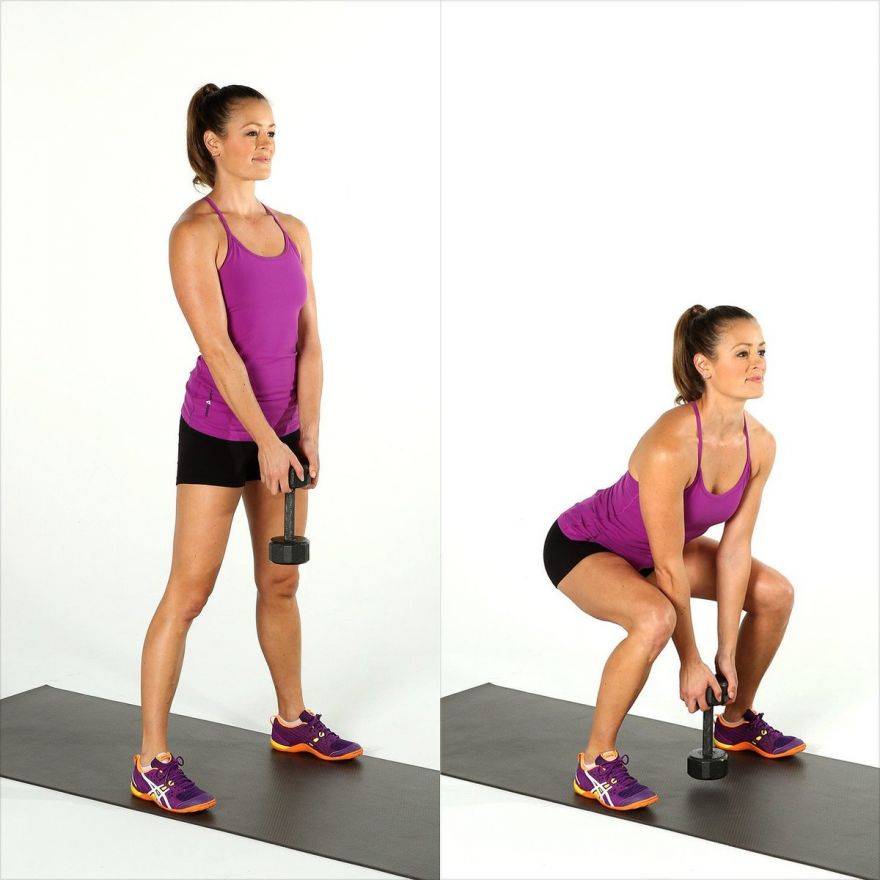 Как выполнять: Поставьте ноги как можно шире и возьмите гантель вертикально за один из дисков. Приседайте до параллели с полом, отводя таз назад. Во время приседаний держите снаряд на вытянутых вниз руках, не меняя его положения. Поднимайтесь из приседа за счет ягодиц, а не бедер или мышц корпуса, для этого держите фокус внимания на работающих мышцах.