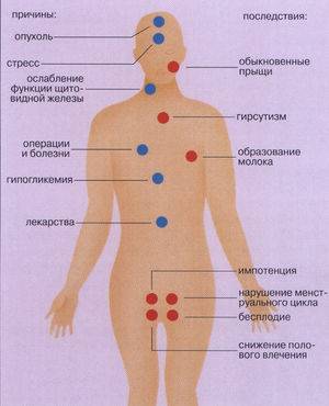 Поскольку тестостерон и пролактин зависят друг от друга, чем больше в организме пролактина, тем меньше тестостерона. Соответственно, чем ниже уровень мужского гормона, тем больше различных проблем может возникнуть.