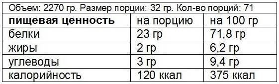 В одной порции комплекса содержится высокая доля чистых протеинов – 23 грамма, что составляет 72% от общей массы. Оставшиеся 9 грамм приходятся на полезные компоненты, среди которых полезные липиды – 2 грамма, и сложные углеводы – 3 г на порцию.