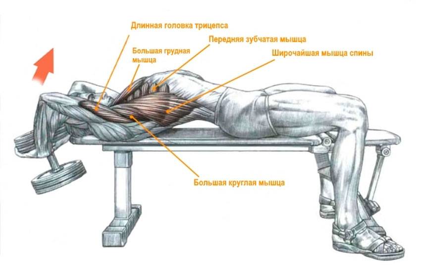 Находясь в стартовой позиции, трицепсы и грудные мышцы растянуты. При исполнении упражнения на горизонтальной скамье, широчайшие мускулы включены в работу в начале движения, но мало проявляют себя, поскольку пребывают в анатомически неудобной позиции. При подъеме рук из-за головы, наибольшее напряжение получают грудные мускулы и трицепсы, повергаясь в этот момент стрессовому сокращению. Возвращение в исходную позицию задействует, снова включая в работу, широчайшие мышцы, тем самым снимая напряжение с грудных мышц.